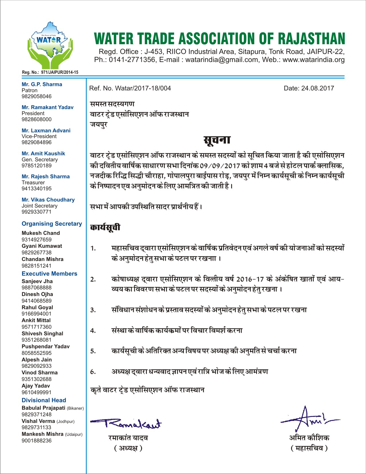 WATAR 2nd Annual General Meeting on 9th Sep. 2017
