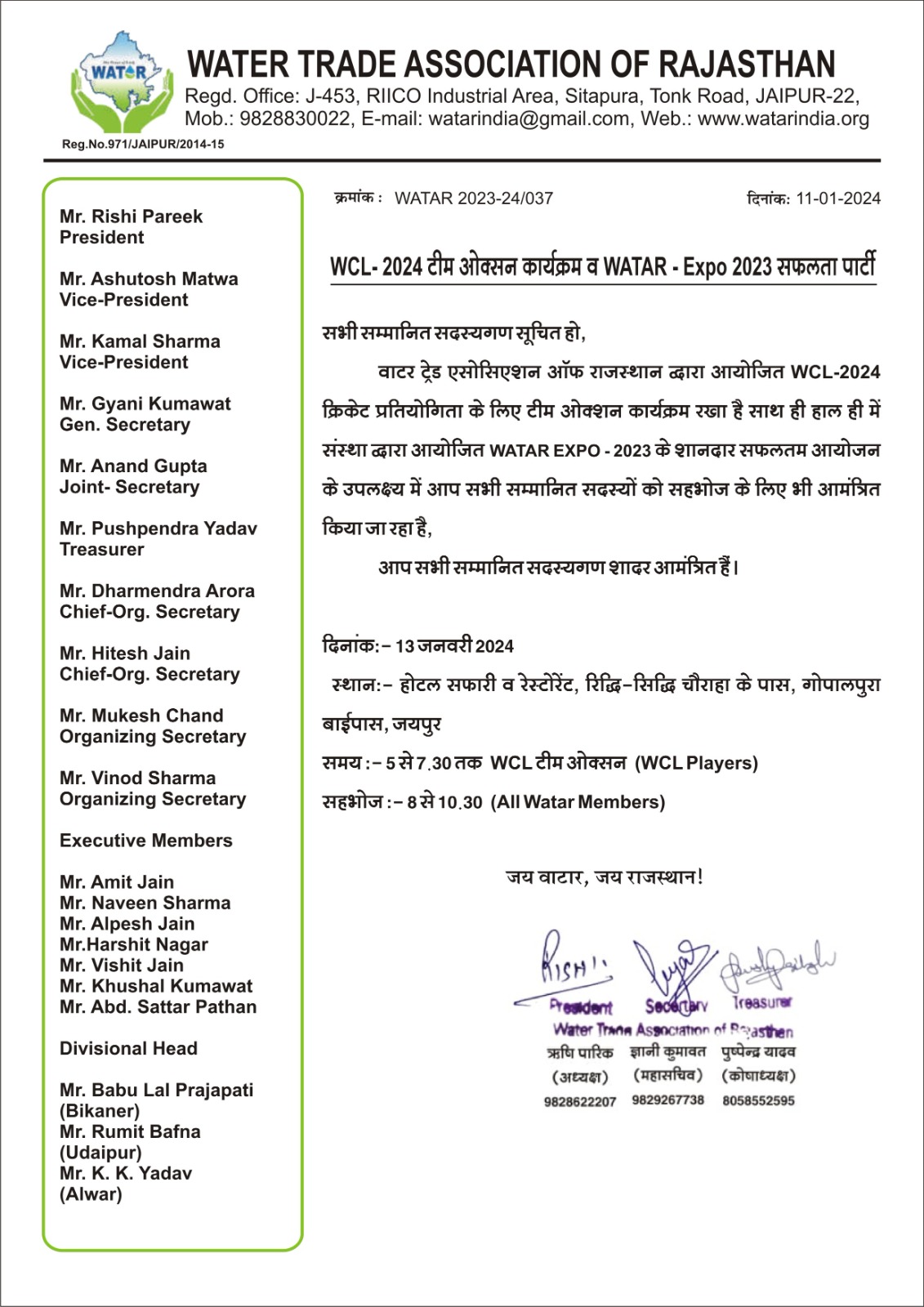सभी साथी गण सूचित हो । आगामी WATAR Cricket League 2024 [...]